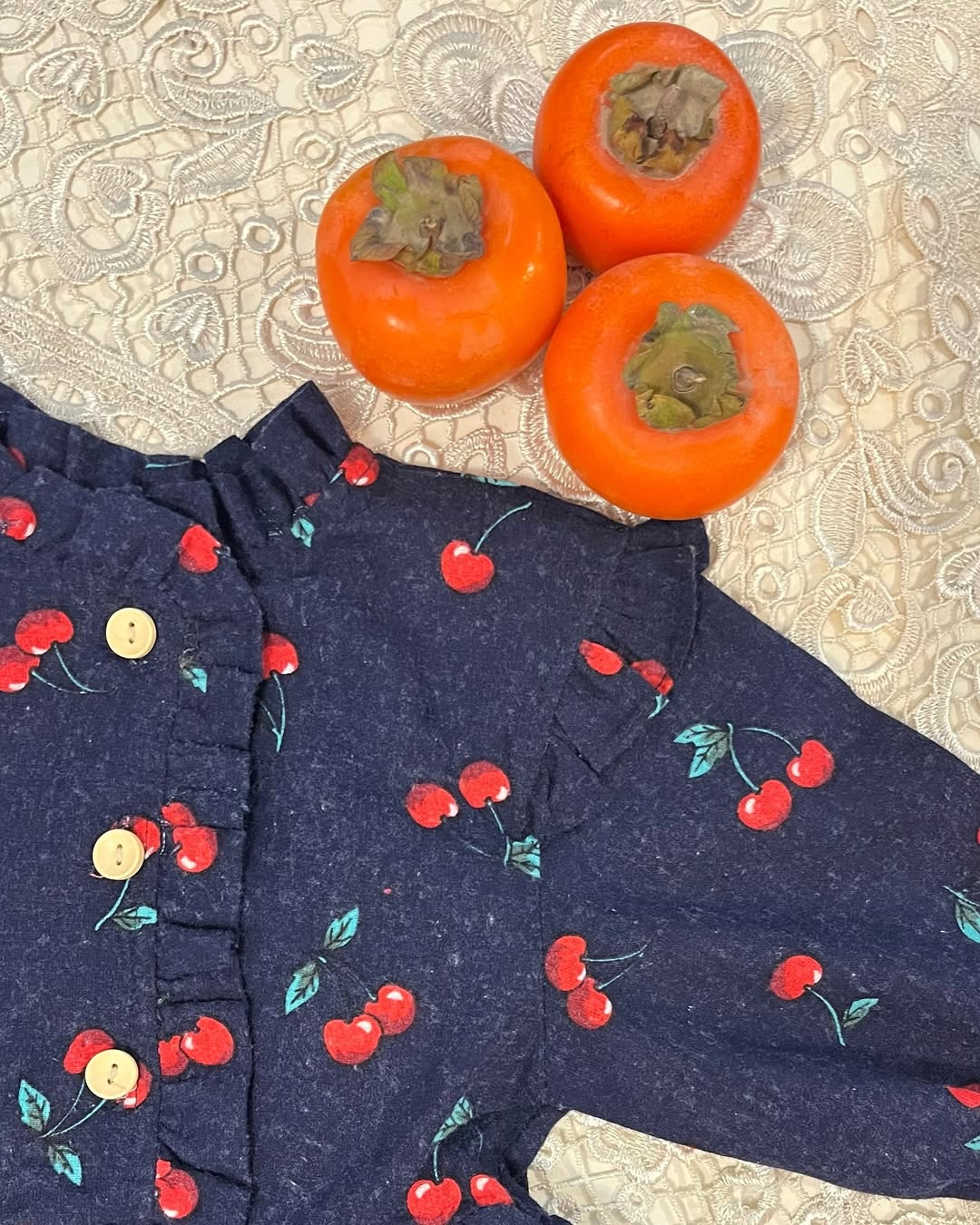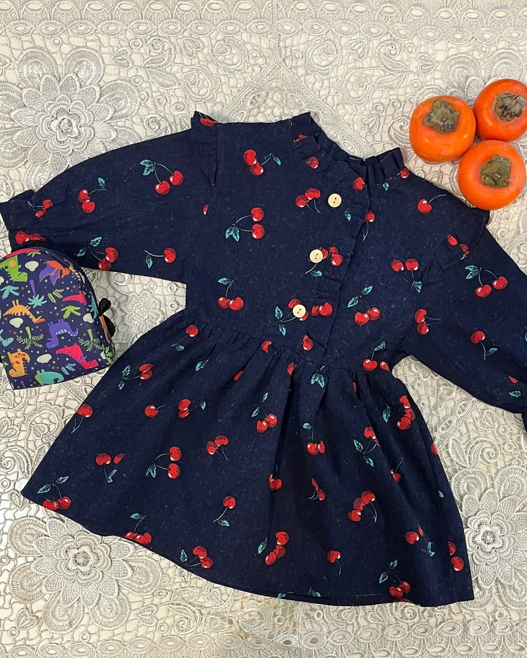 پیراهن لینن کرکی سایز۶ ماه تا ١ سال مناسب پاییز رنگ سرمه ای با طرح گیلاس