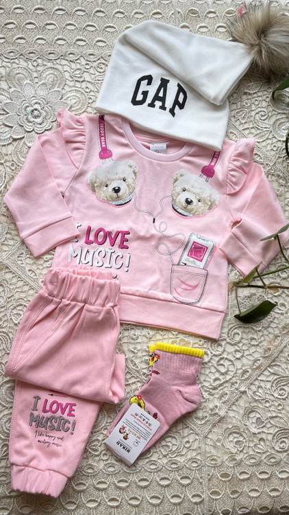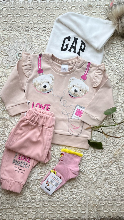 ست بلوز و شلوار نوزادی دخترانه جنس پارچه بسیار با کیفیت و لطیف طرح خرس هدفون دار