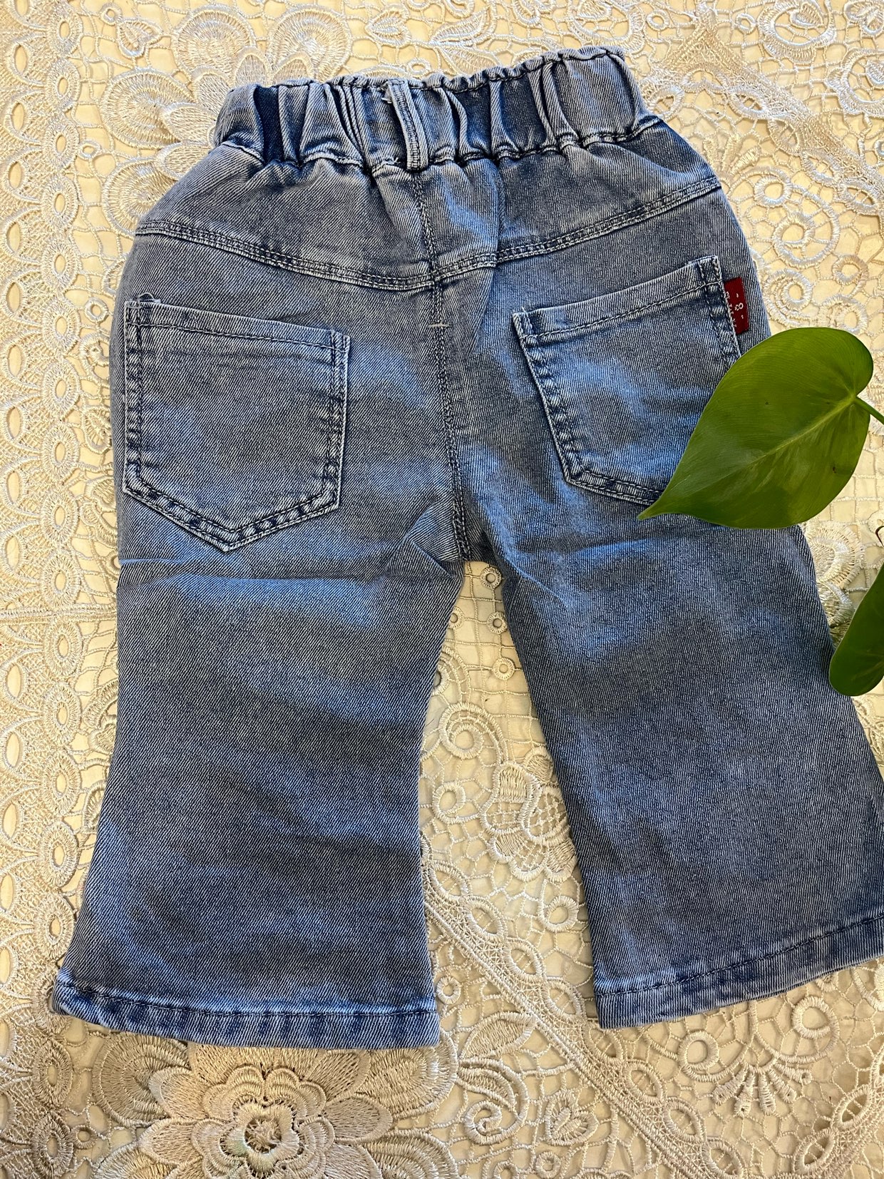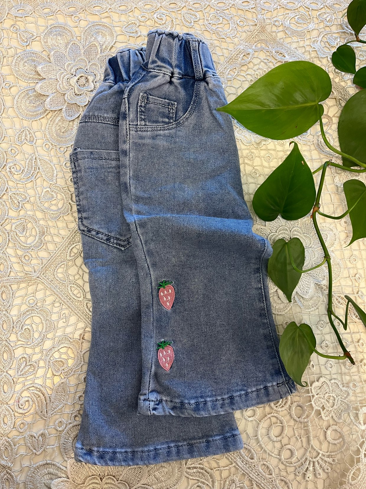 شلوار جین نقلی دخترانه رنگ آبی با گلدوزی توت فرنگی جنس لی نرم و لطیف