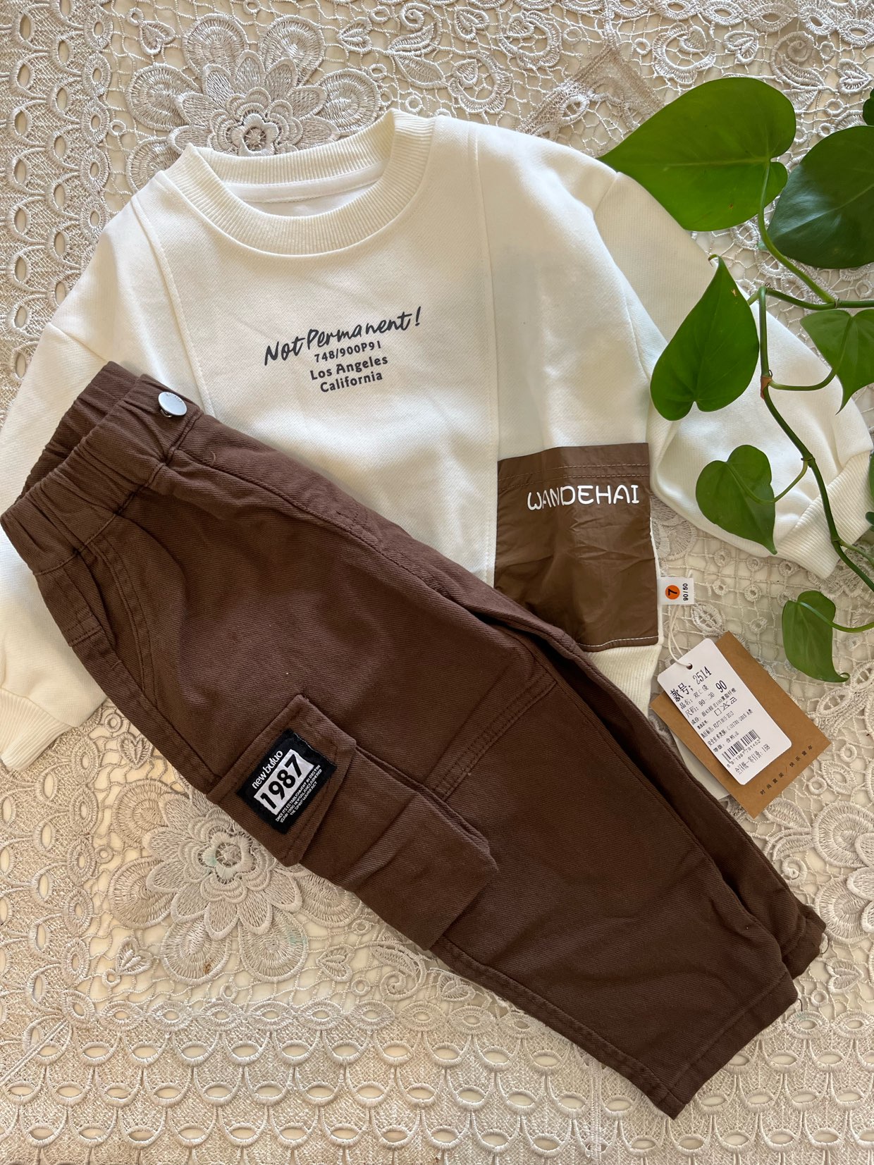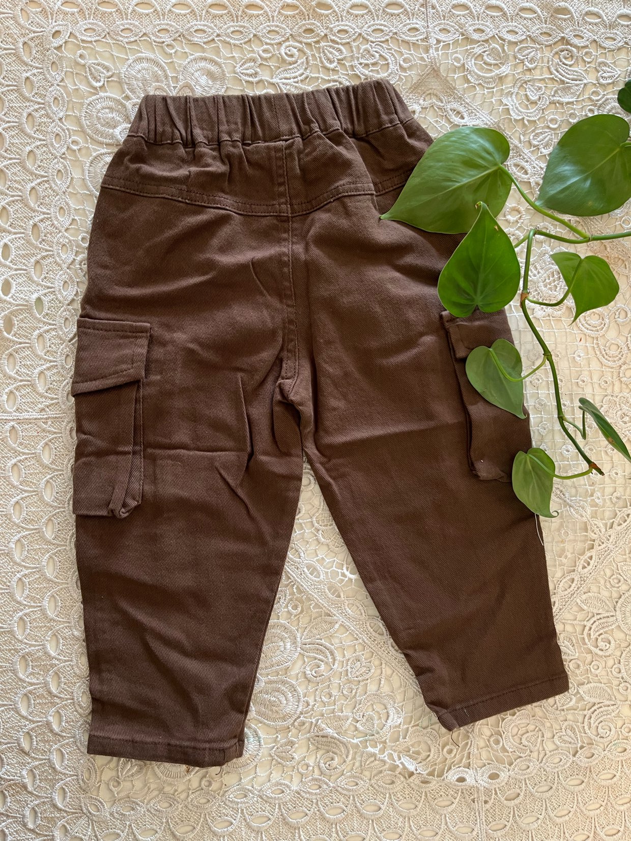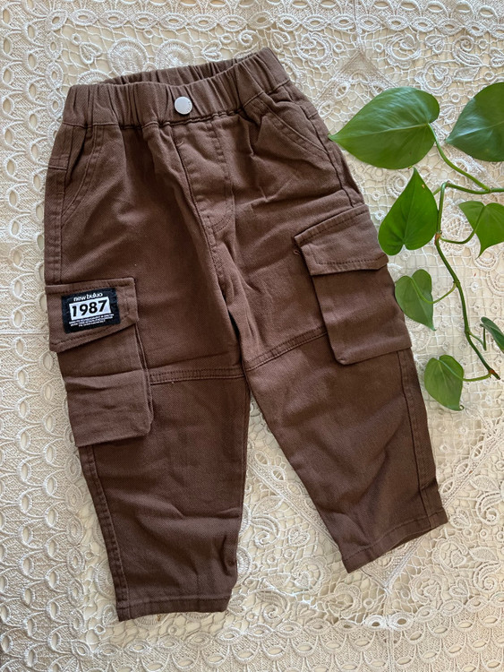 شلوار کتان نقلی قهوه ای مدل مام استایل طرح جیب بغل زانو سایز۶ ماه تا ٢ سال